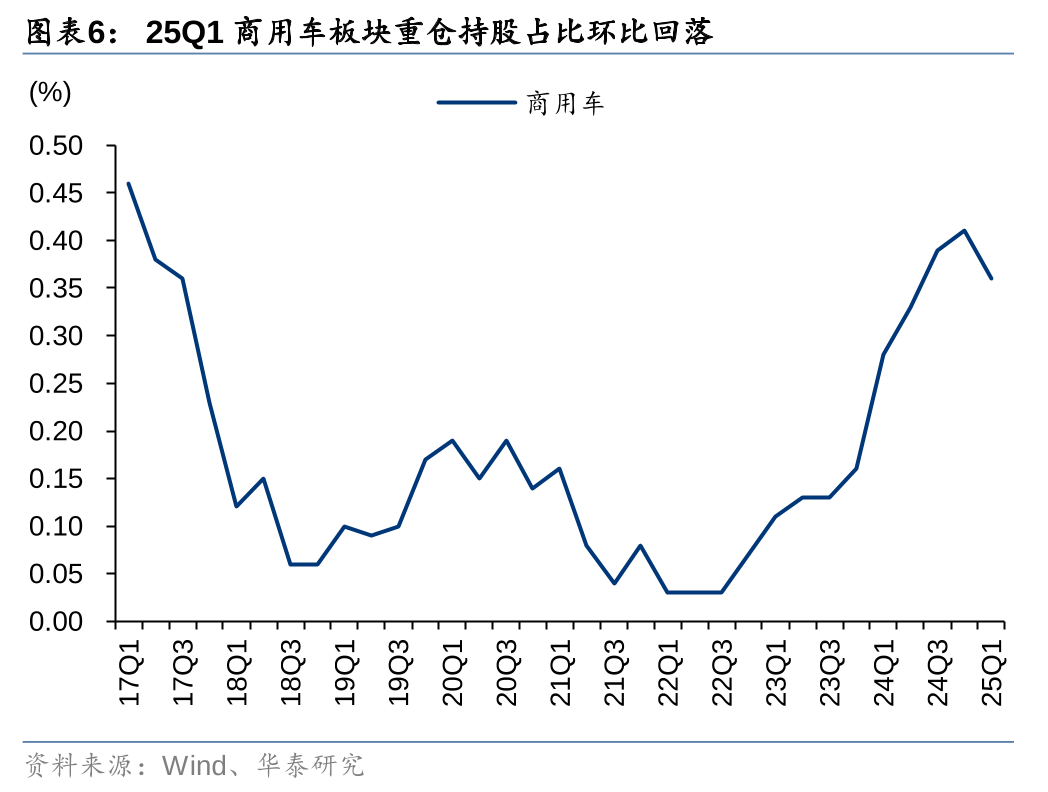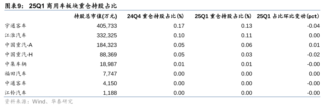 商用车板块中,24Q4持仓占比整体平稳,各公司持仓占比环比变化幅度在0.02pct以内,宇通客车、江淮汽车、福田汽车、中国重汽等占比基本维持不变;25Q1宇通客车、中国重汽-H持仓占比有所下降,分别环比-0.04pct/-0.02pct至0.13%/0.03%,中国重汽-A占比环比+0.01pct至0.06%。