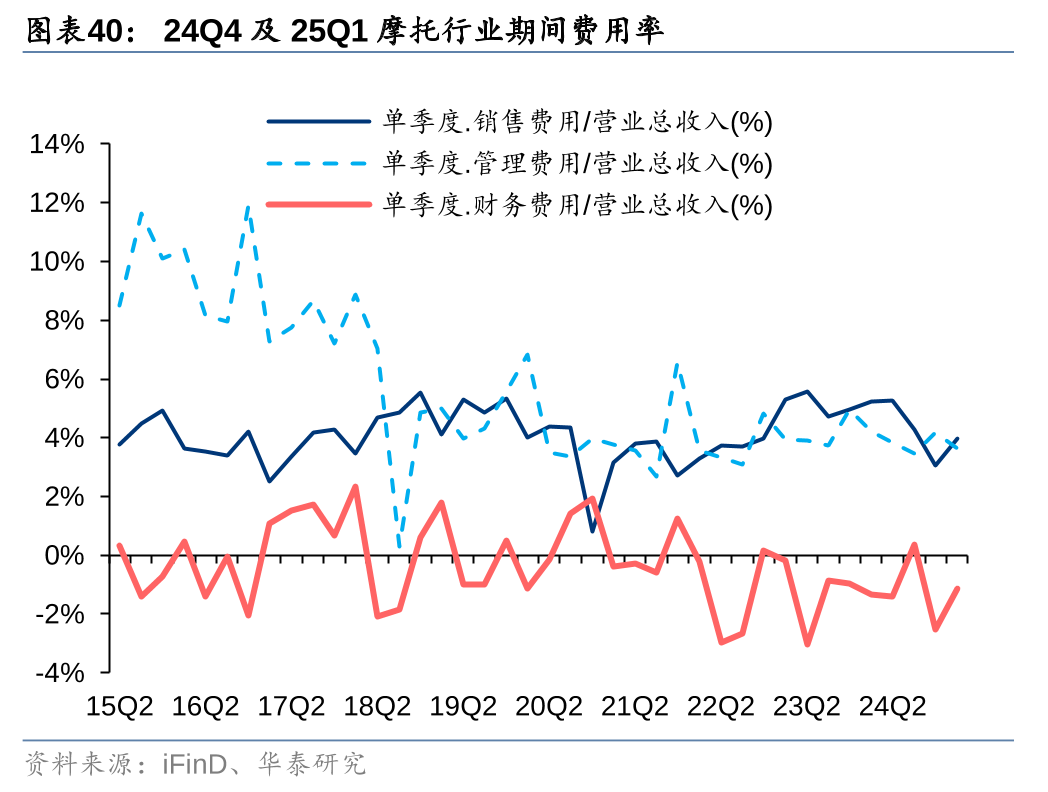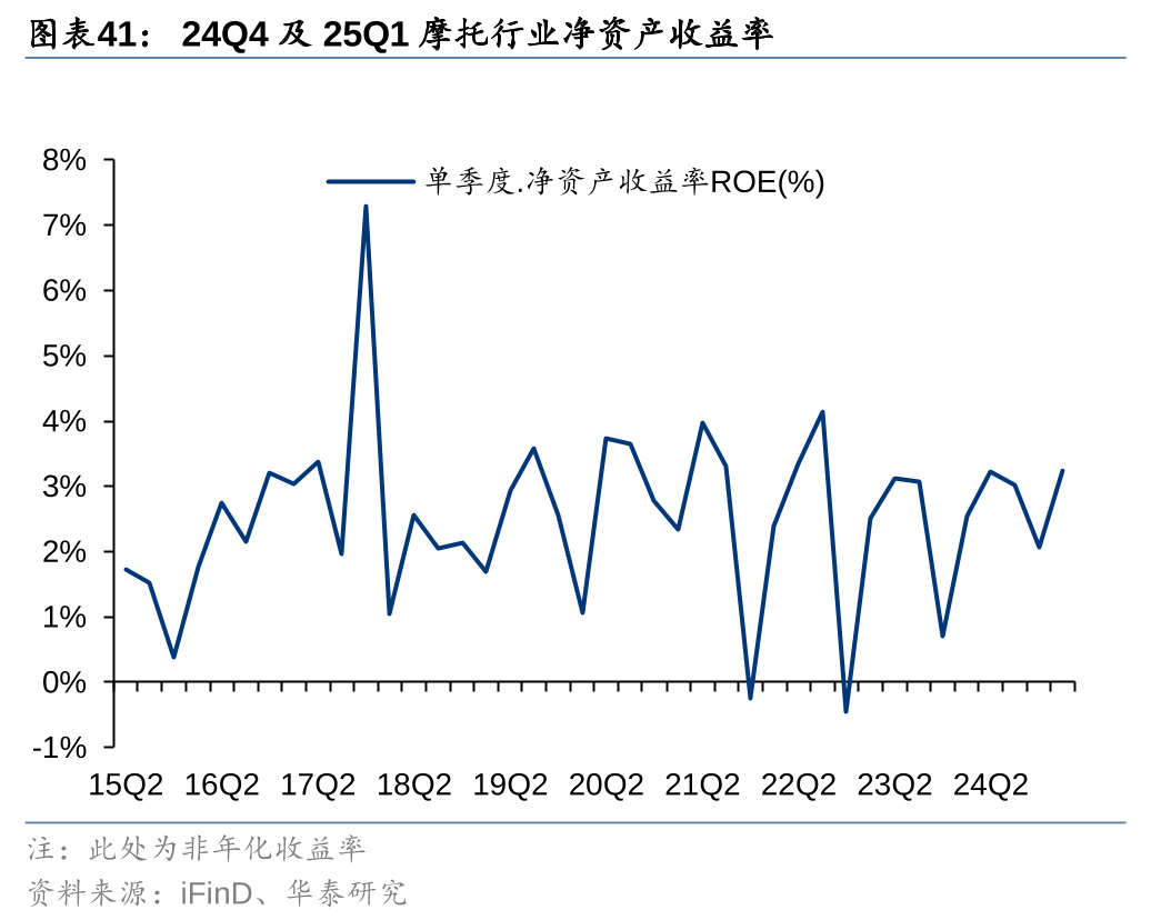 24Q4摩托板块销售/管理/财务费率分别为3.06%/4.18%/-2.53%,同比-1.91/-0.77/-1.56pct,环比-1.20/+0.71/-2.90pct;25Q1摩托板块销售/管理/财务费率分别为3.97%/3.63%/-1.13%,同比-1.25/-0.56/+0.19pct,环比+0.91/-0.54/+1.40pct。摩托行业24Q4/25Q1的净资产收益率环比分别-0.96/+1.19pct,同比提升1.34/0.71pct至2.06%/3.25%。