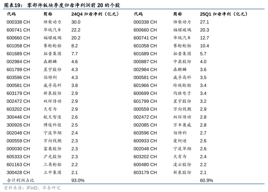 板块内,24Q4/25Q1归母净利前20的个股累计利润占比为93.0%/60.9%(24Q3占比73.2%),包括龙头企业潍柴动力、华域汽车、福耀玻璃、赛轮轮胎、拓普集团,以及各细分赛道的领先企业。