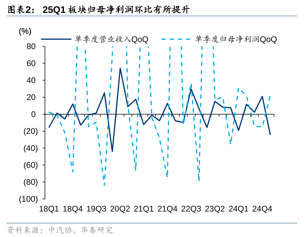 25Q1以旧换新政策快速衔接,刺激终端需求同比向好,乘用车板块营收/归母净利润分别同比+8%/+19%。板块内表现分化:1) 新能源渗透率提升,规模效应增强下自主品牌盈利能力同比改善;2)合资持续承压,以价换量策略收效有限,销量同比继续下滑;3)受汇兑收益影响,汽车及乘用车财务费用率同比大幅下降。展望后市,我们看好Q2各省市促消费政策和自主品牌智能化新车协同发力下,乘用车板块维持高景气,业绩水平进一步向好。