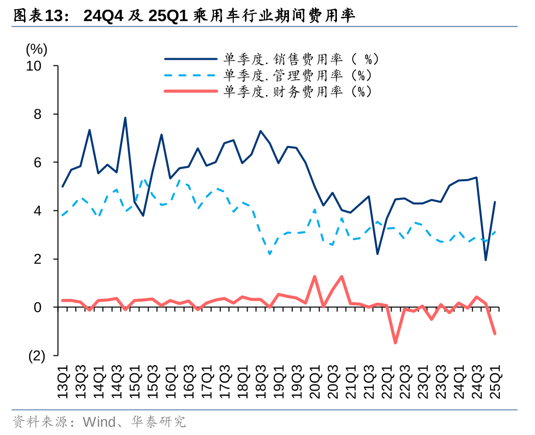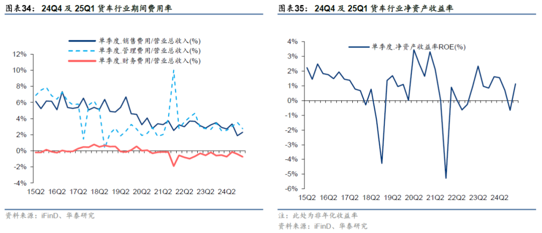 24Q4货车行业销售/管理/财务费用率分别为1.88%/3.53%/-0.40%,同比分别-1.63/+0.09/+0.18pct,环比分别-1.45/+0.49/-0.26pct;25Q1货车行业销售/管理/财务费用率分别为2.32%/2.74%/-0.74%,同比分别-0.60/+0.23/-0.22pct,环比分别+0.44/-0.79/-0.35pct。其中24Q4销售费用率同环比大幅下降主要系会计准则调整,将部分质保类费用从销售费用划分为营业成本,并且对全年进行追溯调整,也导致25Q1销售费用率同比降低但环比提升。