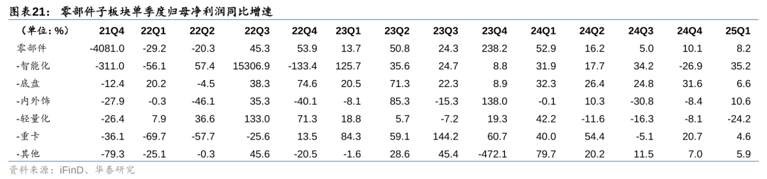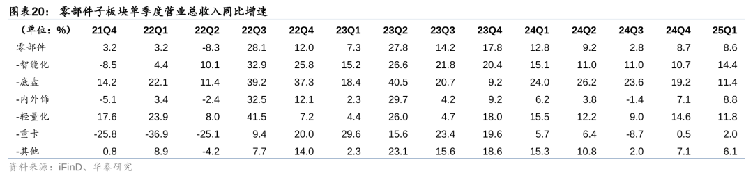 我们将零部件板块成分股进一步拆分为细分子板块来看,25Q1智能化、底盘等子板块收入增速优于零部件板块整体增速。