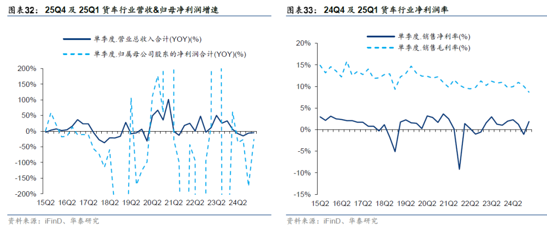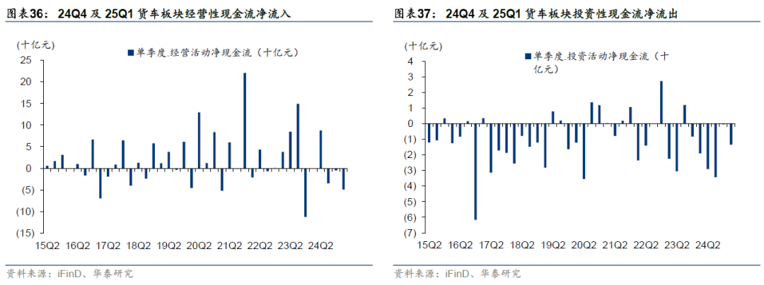 24Q4/25Q1货车板块经营性现金流净流入-5.1/-49.1亿元,流入净额同比分别变动+107.7亿元/-48.3亿元,环比分别变动+29.9亿元/-44.1亿元;投资性现金流净流出0.4/13.5亿元,流出净额同比分别-7.9/-5.6亿元,环比分别-33.8/+13.1亿元。