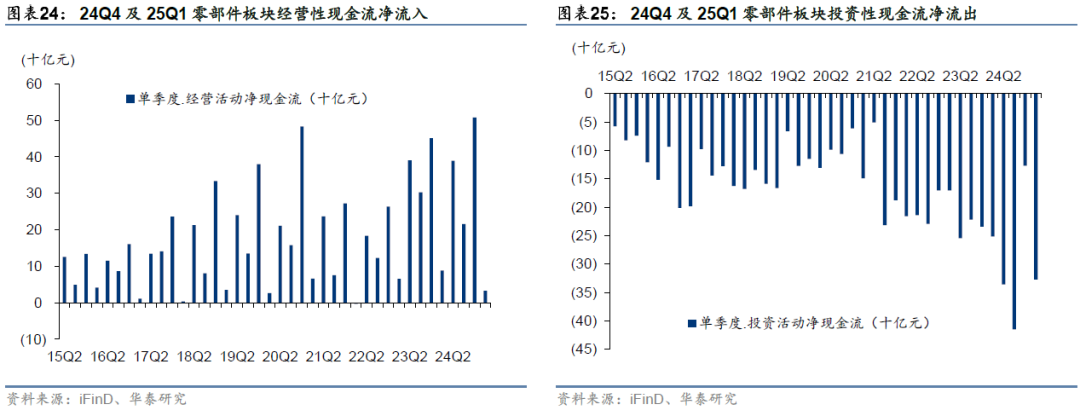 24Q4及25Q1零部件板块经营性现金净流入507.3/32.9亿元,环比+291.8/-474.4亿元,Q1现金流环比下滑或系部分龙头企业回款效率略降所致,同比分别增加流入561.5/-55.3亿元;投资性现金流净流出126.9/327.0亿元,环比分别增加流出-288.2/200.1亿元,同比多流出-107.6/75.2亿元。