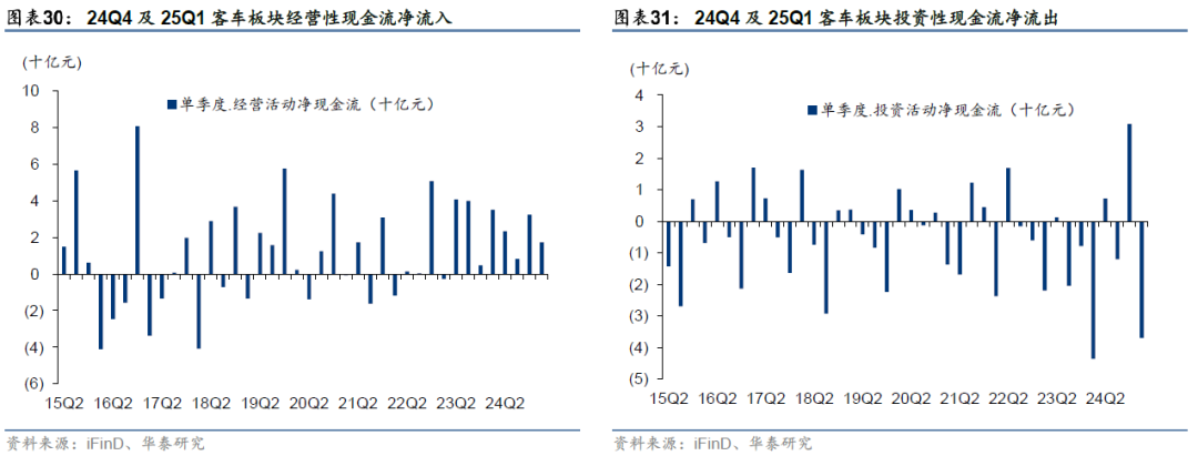 24Q4/25Q1客车板块经营性现金流净流入32.3/17.3亿元,同比变动+27.6亿元/-17.7亿元,环比变动+24.1亿元/-15.0亿元,投资性现金流净流出分别为-30.8/+36.9亿元,流入净额同比分别-38.6/-0.67亿元,环比分别-42.9/+67.7亿元。