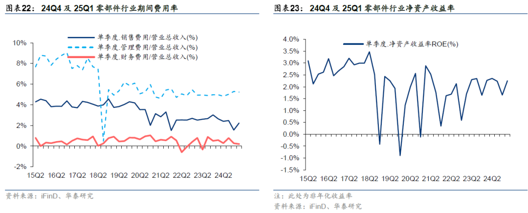 24Q4零部件企业的销售/管理/财务费用率分别为1.56%/5.29%/0.27%,环比-0.92/+0.27/-0.52pct,同比-1.47/+0.32/-0.24pct,销售费用率同环比大幅下降主要系24Q4会计准则调整,将部分质保类费用从销售费用划分为营业成本,并且对全年进行追溯调整。25Q1零部件企业的销售/管理/财务费用率分别为2.23%/5.24%/0.20%,环比+0.68/-0.05/-0.07pct,同比-0.40/+0.26/-0.37pct。24Q4/25Q1的净资产收益率环比分别-0.58/+0.60pct至1.65%/2.26%。