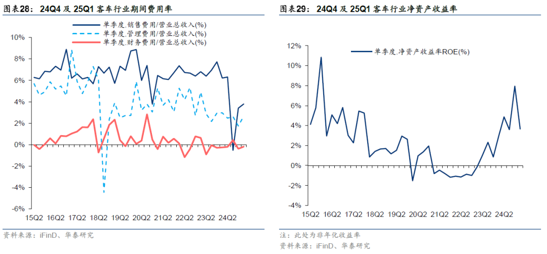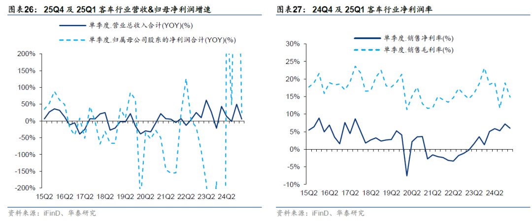 24Q4/25Q1客车行业出口表现良好,板块归母净利润同比大幅增长。24Q4/25Q1客车板块营业收入同比增长+49.47%/+5.15%,归母净利润同比增长803.72%/24.38%。据中汽协数据,24Q4/25Q1客车出口3.2/3.4万辆,同比+8.7%/+8.0%。我们看好客车出海主线延续,并带动客车板块盈利能力不断改善,24Q4/25Q1客车板块毛利率分别为18.87%/14.85%,同比-4.27/-3.61pct,环比+7.19/-4.03pct;净利润率分别为7.19%/5.98%,同比+5.91/+0.92pct,环比+1.90/-1.21pct,其中毛利率同比下滑主要系会计准则调整影响(部分质保类费用调整至营业成本),净利率同比显著改善主要系客车销量同比实现增长以及海外出口盈利性较高。客车行业24Q4/25Q1的净资产收益率环比分别+4.36/-4.29pct,同比提升7.09/0.76pct至7.95%/3.66%。