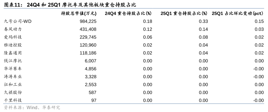 摩托车及其他板块中,九号公司-WD 24Q4和25Q1重仓持仓占比0.18%/0.33%,环比+0.05pct /+0.15pct;春风动力重仓持仓占比0.12%/0.14%,环比-0.00/+0.03pct。