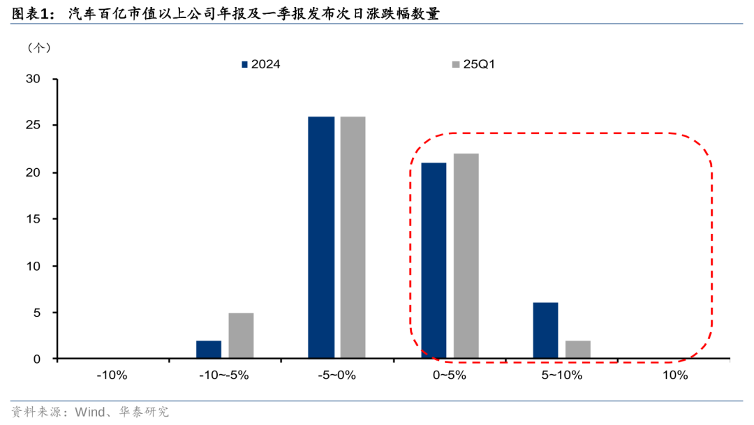 我们选择SW汽车板块成分股为样本,筛选截至25年4月30日,百亿以上市值的公司,对其24年年报及25年一季报发表次日的公司股价表现进行分析:在累计55家市值百亿以上的公司中,年报及一季报公布后分别有49%/44%的企业次日股价上涨,较24Q3的36%有所提高。