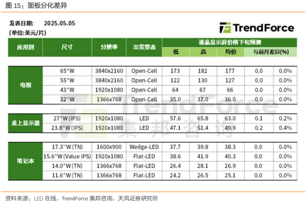 笔记本面板市场近期维持平稳运行态势,整体价格在4月至5月期间呈现横盘整理格局。从供需两端来看,市场参与者均保持审慎态度:综合来看,2025年第一季度面板价格的波动主要受三方面因素影响。一是需求端驱动与制约并存,中国大陆的“以旧换新”等政策在初期有效提振了电视面板需求,但政策效应后期有所减弱。而北美市场的季节性促销结束后,也导致需求出现回落。品牌方的库存水位成为影响其采购策略的关键因素,高库存抑制了后续的采购意愿。