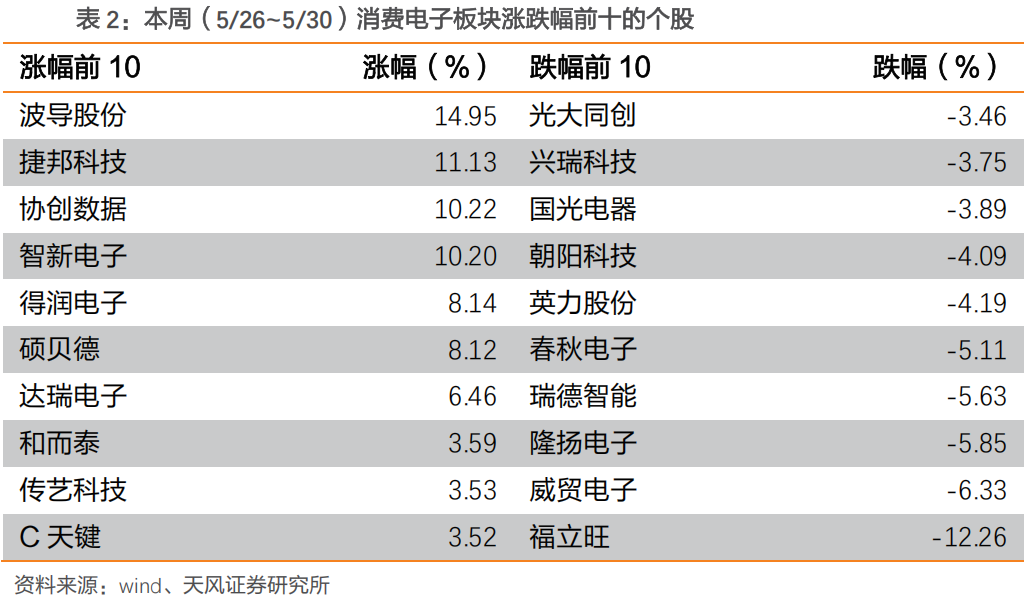 本周(5/26~5/30)消费电子板块涨幅前10的个股为:波导股份、捷邦科技、协创数据、智新电子、得润电子(维权)、硕贝德、达瑞电子、和而泰、传艺科技、C天键。