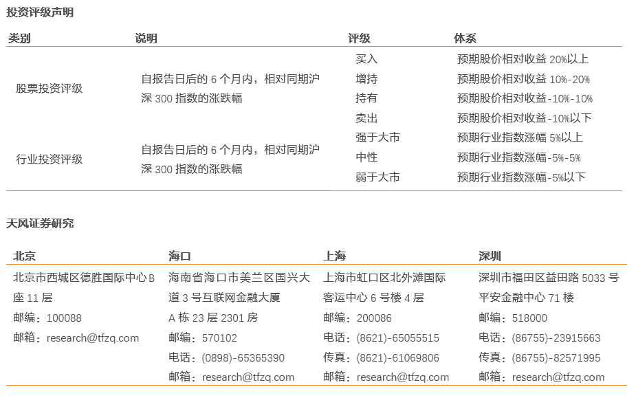 本报告是机密的,仅供我们的客户使用,天风证券不因收件人收到本报告而视其为天风证券的客户。本报告中的信息均来源于我们认为可靠的已公开资料,但天风证券对这些信息的准确性及完整性不作任何保证。本报告中的信息、意见等均仅供客户参考,不构成所述证券买卖的出价或征价邀请或要约。该等信息、意见并未考虑到获取本报告人员的具体投资目的、财务状况以及特定需求,在任何时候均不构成对任何人的个人推荐。客户应当对本报告中的信息和意见进行独立评估,并应同时考量各自的投资目的、财务状况和特定需求,必要时就法律、商业、财务、税收等方面咨询专家的意见。对依据或者使用本报告所造成的一切后果,天风证券及/或其关联人员均不承担任何法律责任。