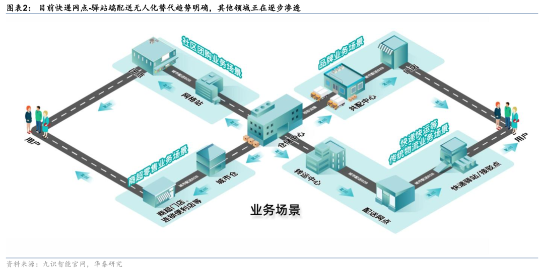 无人物流车 Robovan目前在快递领域,特别是网点-驿站端无人化降本需求驱动下,正在加快商业化步伐,随着快递末端低速配送场景跑通,我们认为该合作模式有望逐步往生鲜、商超等其他城配领域拓展。目前行业公司包括:(1)一级创业公司:具备L4智驾技术和物流经验的新石器、九识智能、白犀牛等;(2)配送公司:菜鸟、美团等;(3)L4多场景公司:文远知行等。行业头部企业新石器、九识等正在快速生产车辆满足下游需求,新石器在手订单已经超过2万台。我们认为无人物流车有望成为智能驾驶L4快速商业化落地的第一环,建议关注快递公司、运营公司、零部件公司等投资机会。