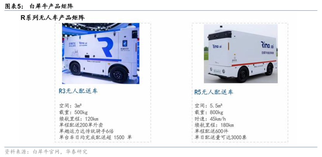 3)白犀牛定位 “无人驾驶服务运营商”,与顺丰物流、永辉超市达成战略合作。白犀牛智达(北京)科技有限公司成立于2019年3月13日,专注于提供城市公开道路末端配送的L4自动驾驶解决方案,由百度自动驾驶团队前成员朱磊和夏添共同创立,是国内首家在城市公开道路开展生鲜商超无人配送的L4级自动驾驶企业。公司定位于“无人驾驶服务运营商”,以软硬件+运营模式切入末端即时配送领域,核心场景包括药品、生鲜和商超物流。截至2025年,白犀牛已在北京、上海、深圳等城市实现常态化运营,并与顺丰物流、永辉超市达成战略合作。公司获得ISO22737整车L4自动驾驶国际安全认证及国内工信部、公安部双重认证,技术层面凭借单Orin芯片实现40km/h公开道路自动驾驶,成为业内唯一采用单Orin芯片完成公开道路40公里以上L4自动驾驶的企业。