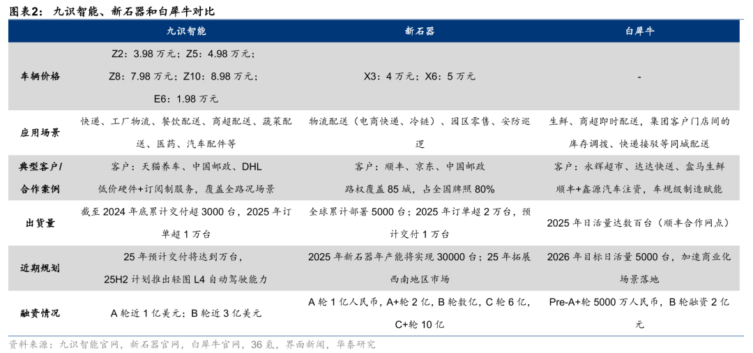 3)规模扩张条件成熟,头部玩家在融资/产能等方面快速扩张。九识智能已完成近3亿美元B轮融资;新石器建成万台级智造工厂,2025年目标交付超2万台;白犀牛2026年目标日活量5000台。