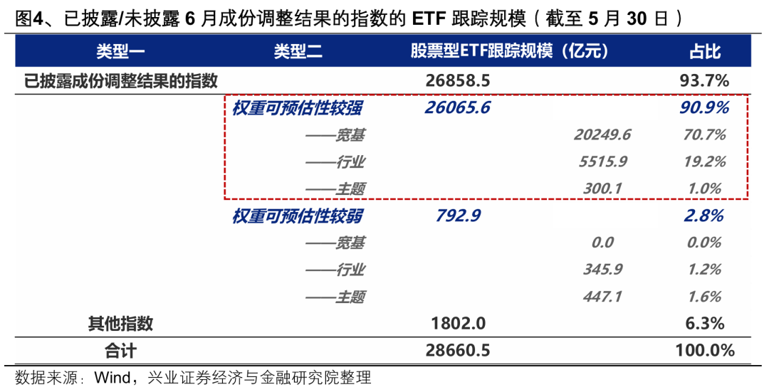 当前,大多数指数已披露将于6月调整生效的指数成份名单。根据指数编制规则,其中大部分指数的权重计算方法较为简便、直接,如采用自由流通市值分级靠档加权、总市值加权、股息率加权等,针对这部分权重可测算性较高且已披露成份调整结果的指数(覆盖股票型ETF规模约91%),我们基于5月末数据计算拟生效的指数成份权重,并进一步结合跟踪的股票型ETF规模,测算出各行业和个股因指数调整带来的被动资金流入/流出规模。