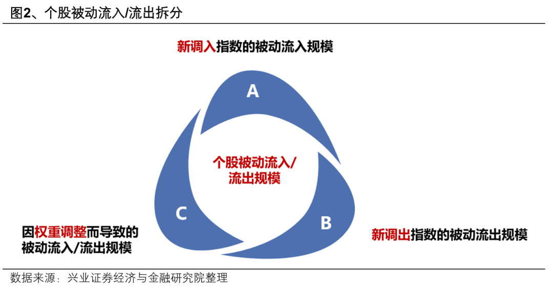 对于同一公司,当其被新调入指数时,有可能同时从其他指数中调出,同时也可能会因所在指数的权重调整而导致跟踪的ETF资金被动流入或流出。因此,在指数调整过后,行业和个股的ETF资金被动流入/流出规模实际上取决于三个方面: 1)新调入指数的被动流入规模、2)新调出指数的被动流出规模,以及3)因权重调整而导致的被动流入/流出规模。