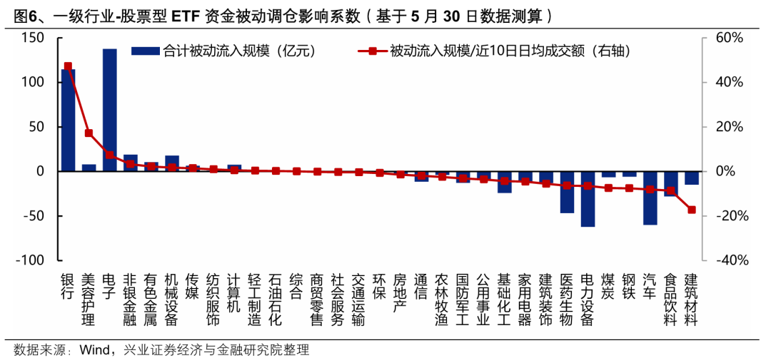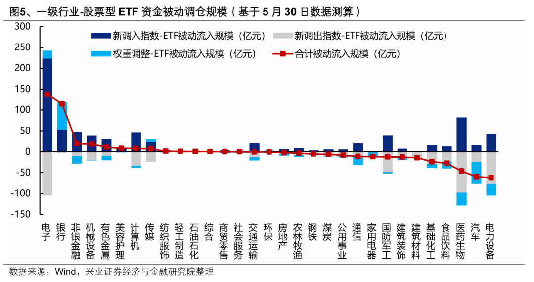 从6月指数调整带来的股票型ETF资金被动调仓规模看,一级行业中,电子、银行、非银金融、机械设备、有色金属被动流入规模居前,而电力设备、汽车、医药生物、食品饮料、基础化工等行业则被动流出较多。