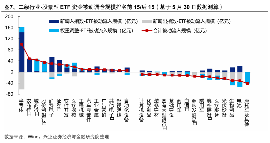 二级行业层面,半导体、农商行、城商行、股份制银行、消费电子等行业被动流入规模居前;摩托车及其他、电池、生物制品、光伏设备、医疗服务等行业被动流出较多。