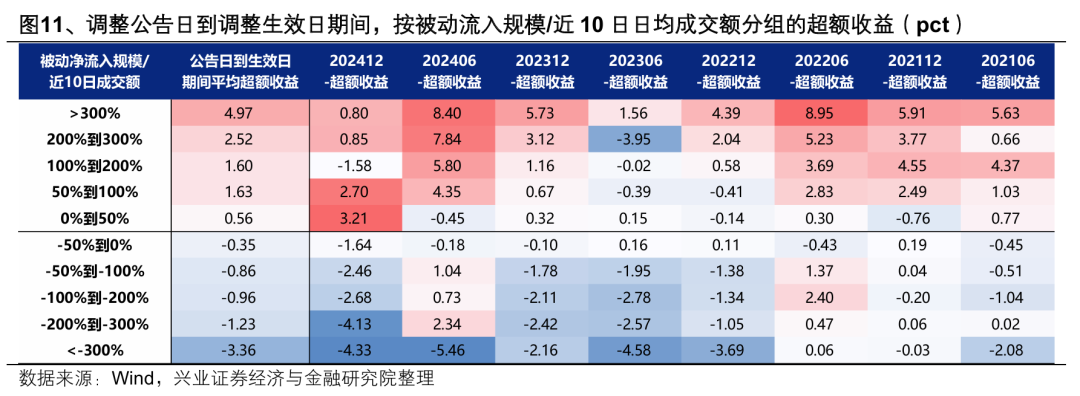 1、从指数调整公告日到指数调整生效日期间,股价表现与被动调仓影响系数(被动流入或流出规模/近10日日均成交额)密切相关,受ETF调仓流入的潜在影响越大,在此期间的超额收益越显著。