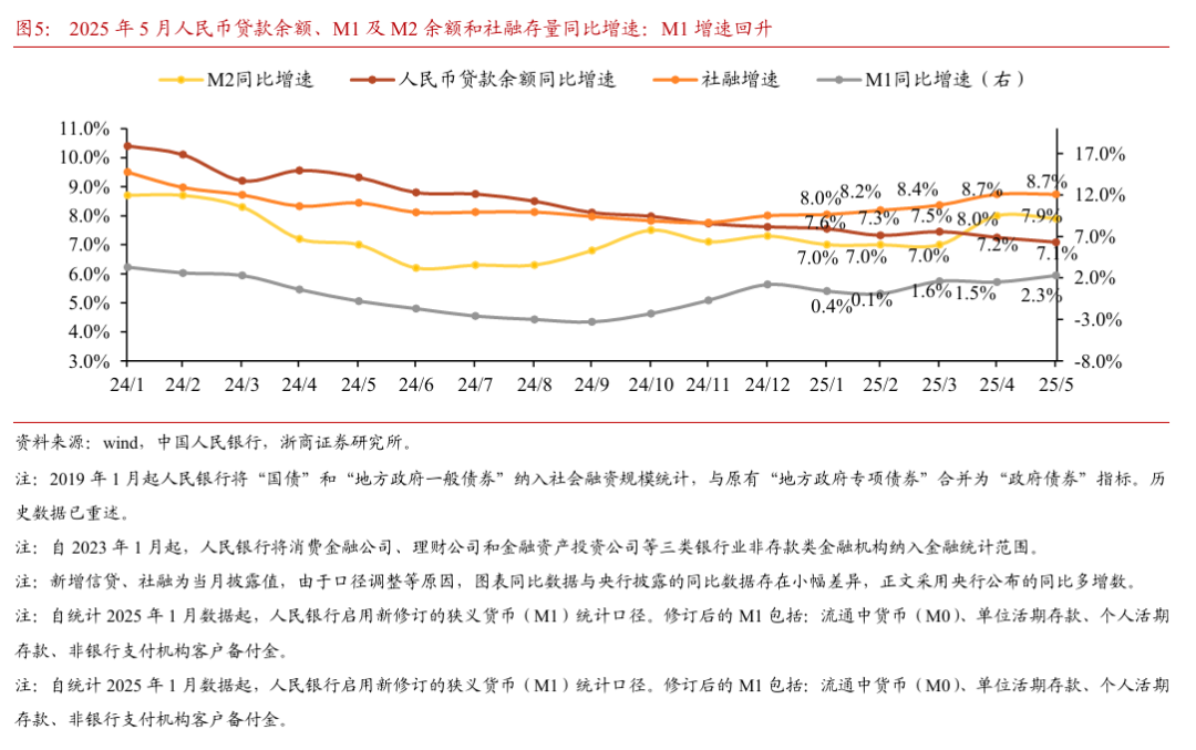 2025年5月社融新增2.3万亿,同比多增2271亿,余额同比增长8.7%,增速环比持平;人民币信贷新增6200亿,同比少增3300亿,余额同比增长7.1%,增速环比收窄0.1pc。2025年5月M1同比增速为2.3%,增速环比提升0.8pc;M2增速为7.9%,增速环比收窄0.1pc。
