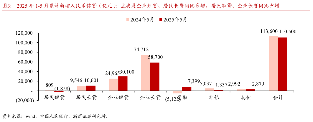 (3)剔除债务置换影响,企业长贷可以基本持平。根据金融时报报道,1-5月对应置换的贷款约有2.3万亿,我们预估5月单月受债务置换影响的信贷规模在2000亿。如果剔除这部分影响,2025年5月企业长贷新增约5300亿,基本可以同比持平。