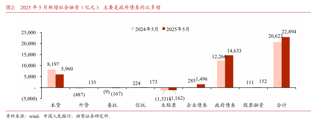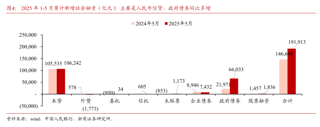 (4)票据未显著补量。2025年5月票据融资新增746亿,同比少增2826亿,一改1-4月大幅补量的情况。如果剔除票据+非银的影响,5月实体信贷接近5000亿,同比多增381亿。我们猜测票据未补量的原因:一是信贷增量(1-5月累计10万亿)跟去年基本持平,基本符合央行的预期,二是低利率票据容易引发资金空转。