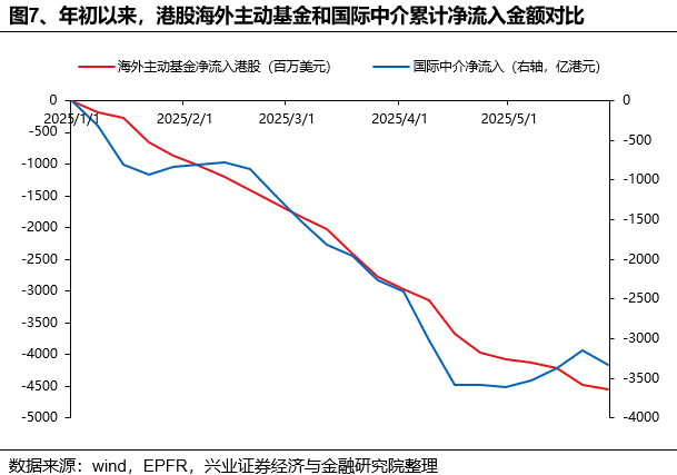 而从国际中介的视角来看,近两个月中外资或延续了年初至今的流出趋势。一方面,对冲基金或于4月底至5月中阶段性有所回流,但持续低位的Hibor利率驱动灵活资金以套息交易的方式转为加仓美元资产。另一方面,根据EPFR数据,以海外主动权益基金为代表的长线资金依然延续流出。