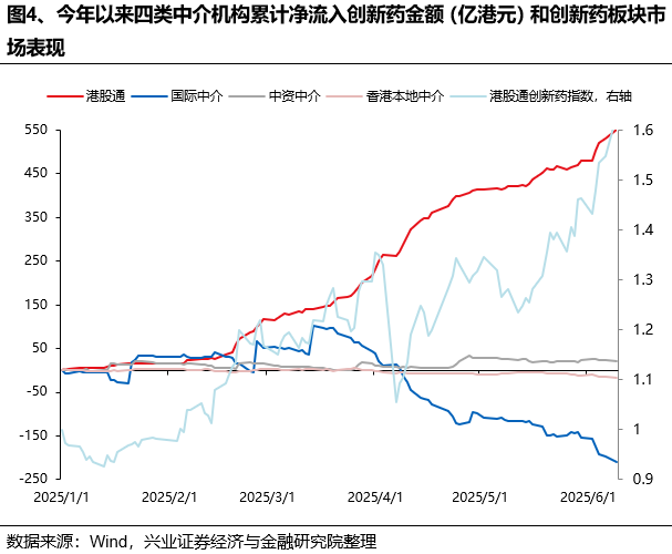 2月中旬以来,南下资金开始稳定持续增持创新药,外资曾在2月底-3月中的港股情绪最“亢奋”阶段与其形成共振,但后续则转为持续流出。2月17日以来,港股通开始加速净流入(截至6月9日累计加仓超520亿港元),支撑创新药板块持续上涨。与之相对的是,2月27日-3月14日,国际中介净流入超百亿港元,但后续则减仓超300亿元。
