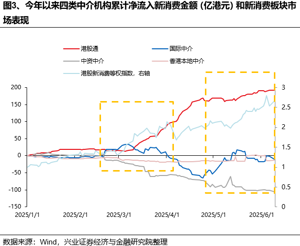 行情节奏方面,外资今年两次率先在新消费板块的行情左侧开始加仓,并选择在快速上涨时期兑现浮盈,而南下资金则主要是右侧做趋势投资。2月20日-3月7日,新消费板块上涨20.3%,期间国际中介净流入36.1亿港元,而港股通小幅减仓,3月8日-4月2日,随着新消费加速上涨,南下资金持续加仓78.1亿元,而外资开始获利了结;4月25日-5月16日,尽管行情较为平淡,但外资大幅加仓超80亿港元,同期港股通小幅净流出,5月17日-6月9日,新消费板块再度上涨24.6%,期间南下资金加速流入26.6亿港元,国际中介则转为减仓。