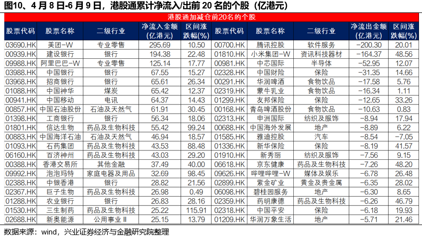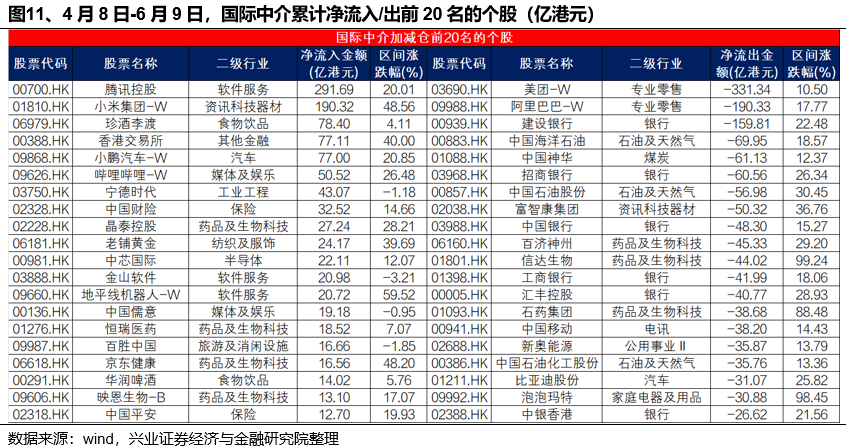 外资显著青睐具有特色商业模式的科技和消费企业,减持红利板块,医药内部有所分化。4月8日-6月9日,国际中介主要加仓腾讯控股、小米集团-W、珍酒李渡、香港交易所和小鹏汽车-W,净流出美团-W、阿里巴巴-W、建设银行、中国海洋石油和中国神华。
