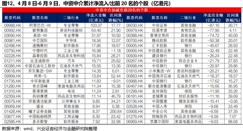 中资中介主要净流入阿里巴巴等科技股,减仓金融行业较多。4月8日-6月9日,中资中介主要加仓阿里巴巴-W、联想集团、美团-W、中芯国际和速腾聚创,净流出中信证券、珍酒李渡、香港交易所、腾讯控股和汇丰控股。