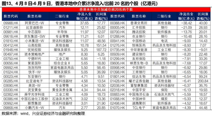 香港本地中介同样以加仓阿里巴巴等科技股并减仓金融行业为主。4月8日-6月9日,香港本地中介主要加仓阿里巴巴-W、比亚迪股份、中芯国际、京东集团-SW和小米集团-W,净流出香港交易所、汇丰控股、腾讯控股、农业银行和中国移动。