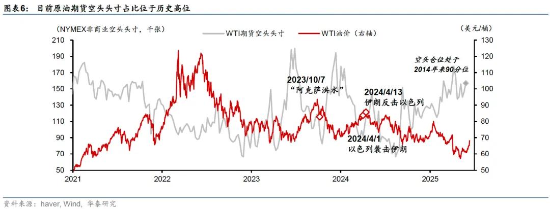 技术层面,市场此前积累了较多原油期货空头头寸,空头平仓可能放大了油价的涨幅。CFTC数据显示,NYMEX原油期货未平仓合约中,空头头寸占比达33%,处于2014年以来90%分位(图表4)。伊以冲突升级大幅推升油价,由此导致的空头平仓可能进一步加大油价的涨幅。