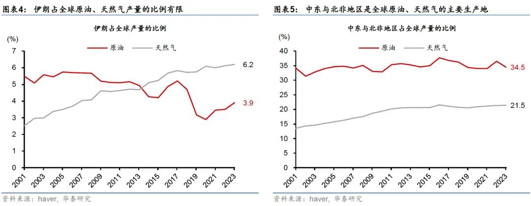 此次伊以冲突迅速升级、且不确定性较高,对油价的推升明显高于2023年12月中旬红海停航的影响,但暂时未达到2023年10月的高点。虽然伊朗占全球能源产量的比例有限,但鉴于以色列宣布全国进入紧急状态、且中东多国已关闭领空,伊以冲突可能会影响伊朗以外能源产品的供给和运输。截至2023年,伊朗分别仅占全球原油、天然气产量的3.9%、6.2%,而中东与北非地区则供应全球34.5%的原油、21.5%的天然气(图表5和6)。相比之下,由于多国货轮在红海及附近海域受到胡塞武装的袭击,2023年12月全球主要航运公司宣布暂停红海航线,布伦特油价仅从低点累计上涨9.5%至81美元/桶,而在2023年10月巴以冲突升级时,布伦特油价短期内上涨10%至92美元/桶。