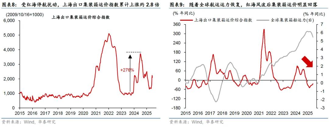 往前看,鉴于极端情况下原油供给可能受到的影响较大,且目前局势不确定性较高,不排除短期油价进一步冲高或大幅波动、并波及全球天然气价格及运价、进而带来更广谱价格上升的可能性。但中长期看,原油供需不支持油价长期持续上涨。目前中东主要国家每日通过霍尔木兹海峡的原油出口量约1,750万桶,约占全球原油贸易的17.5%(图表7)。同时,全球还有约1/4的天然气贸易途径该海峡。如果伊朗选择封锁霍尔木兹海峡,和/或将反击对象扩大至其他美国盟友(尤其在国内政权稳定性下降的情况下),则全球原油和天然气供给短期可能会受到较大影响,短期油价、天然气价格、以及全球运价的波动都可能加剧,甚至可能进一步推动更广谱的价格上涨。例如,在2023年12月红海停航的7个月内,上海出口集装箱运价综合指数累计上涨约2.8倍。然而,中长期看,考虑OPEC+尚有较大规模的闲置产能,再加上特朗普政府对降低油价有较大的政治决心,供需基本面不支持油价长期处于高位——如果油价长期高企,则中长期供给可能增加,其他地缘政治大国介入、形成制衡的概率也将上升。我们在此前俄乌冲突初期、2023年加沙局势升级等事件的演变中均观察到这一点。虽然俄乌冲突、巴以冲突等地缘政治因素在短期内大幅推高油价,但高油价将推升原油供给、并拖累原油需求,进而抑制油价的中长期涨幅。类似地,随着全球航运运力恢复,红海风波后集装箱运价明显回落(图表9)。