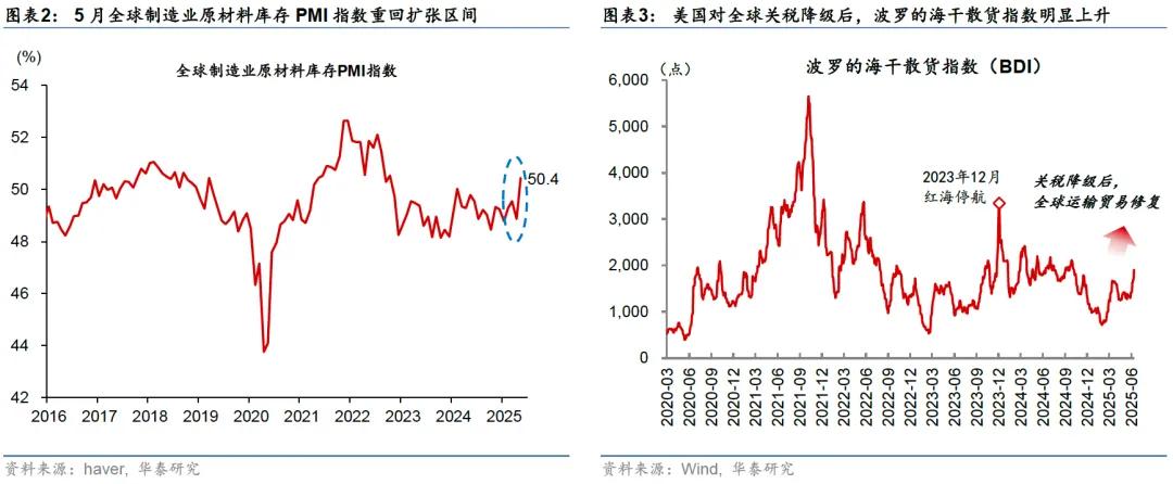 基本面层面,自4月9日美国暂缓执行对等关税、尤其是5月12日中美关税降级后,全球物流恢复、以及对等关税生效前的抢出口可能推升对原油的补库需求。4月2日美国宣布对等关税后,国际油价明显回落,到4月8日的短短几天内,布伦特油价的累计跌幅达16.2%。随着4月9日美国宣布暂缓执行对等关税90天,国际油价小幅反弹,但之后随着OPEC+持续增产再度回落。直到5月12日美中“限制性”关税降级后,国际油价才企稳回升。5月全球制造业PMI原材料库存指数重回扩张区间,显示随着全球物流恢复、以及受7月9日对等关税生效前的抢出口拉动,全球制造业开启补库周期(图表2和3)。