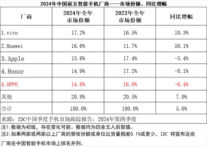 IDC数据显示,2023年,荣耀市场份额为17.2%,OPPO为16.8%,两者分列第四、第五。而到了2024年,两者的全年市场份额分别为14.9%与14.8%,差距只有0.1%,IDC直接将两者并列为第四。
