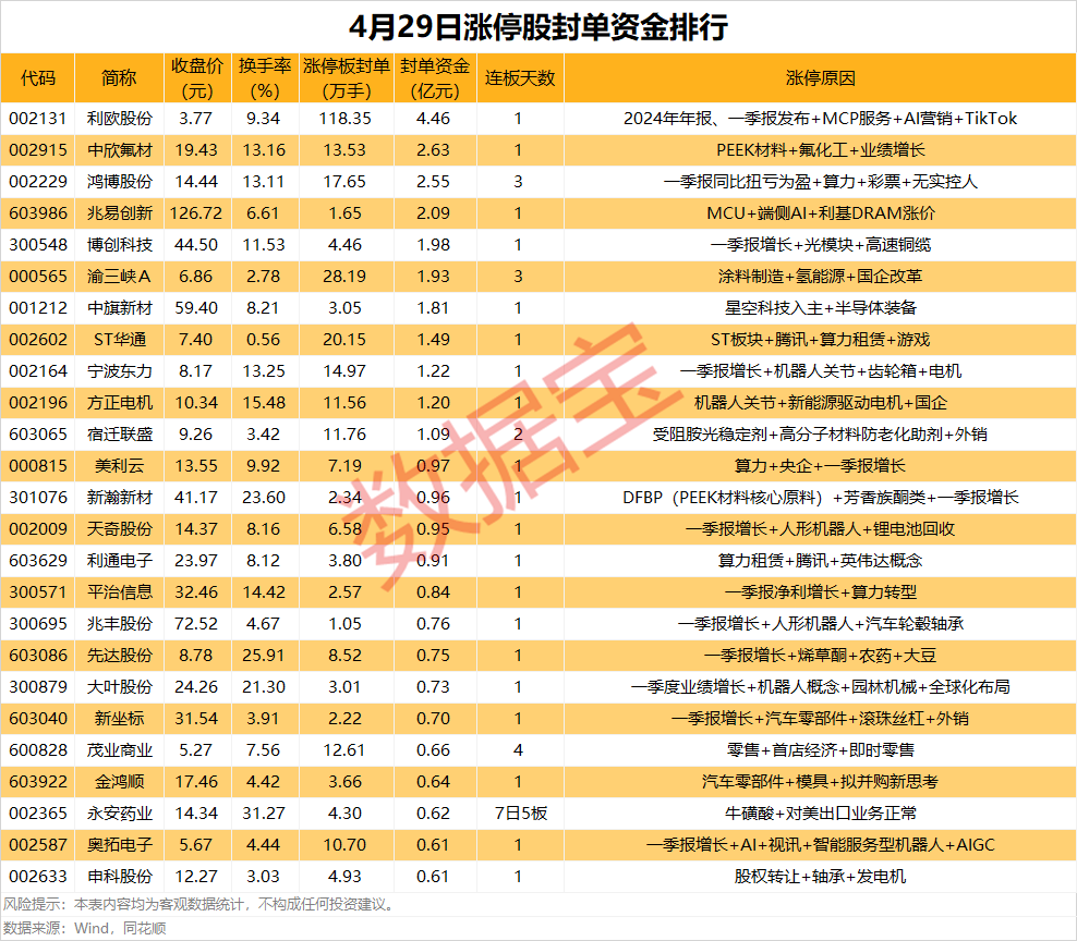 以封单金额计算,11股封单资金超1亿元,利欧股份、中欣氟材、鸿博股份封单资金居前,分别为4.46亿元、2.63亿元、2.55亿元。