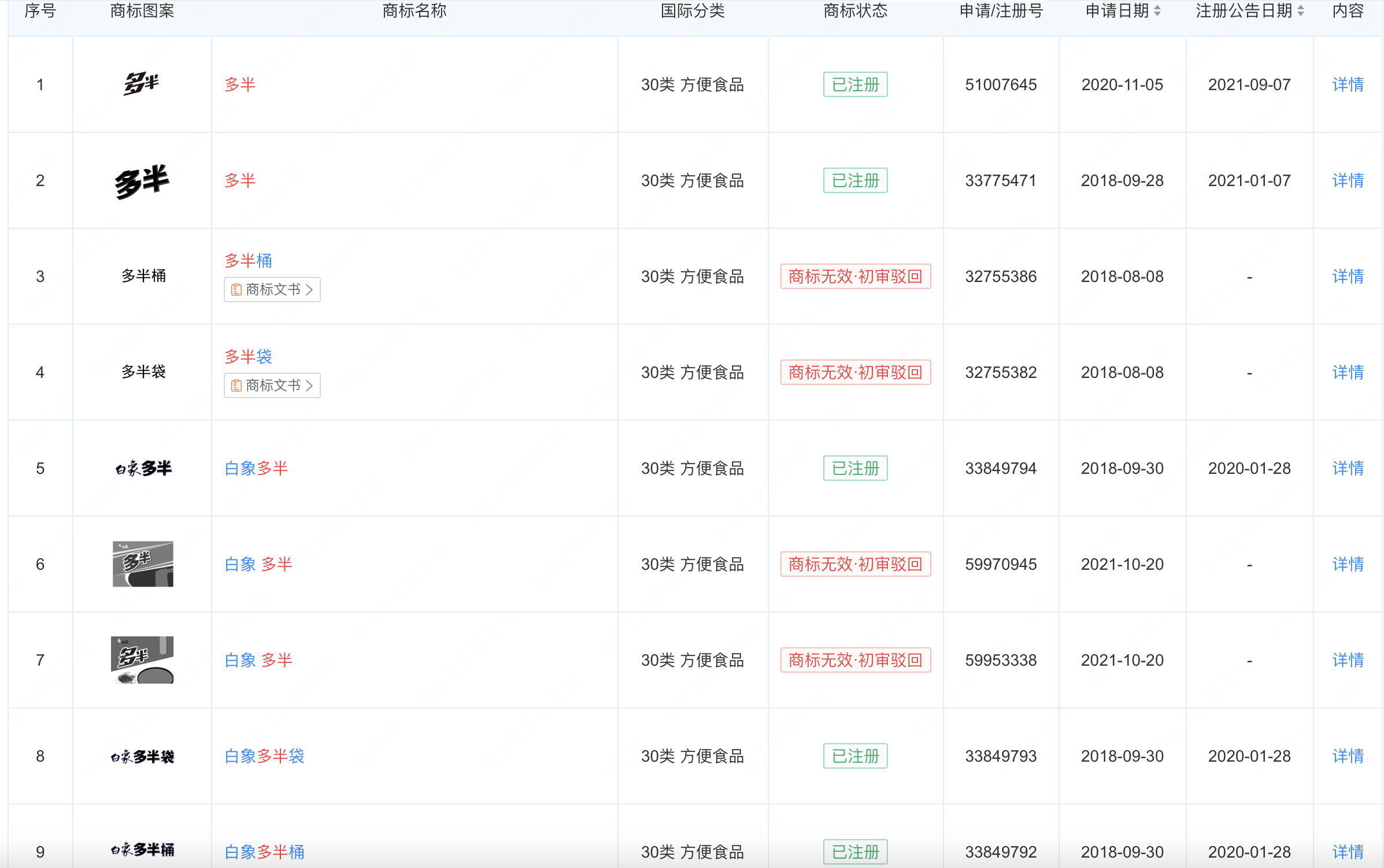 根据企查查,白象已注册成功5个包含“多半袋”“多半桶”的商标,还有9个“多半”相关商标被初审驳回。