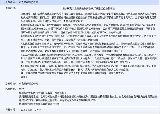针对此举报,重庆食药监局已于8月24日回复称,已启动对该企业调查,现已派出检查组进驻重庆医药工业研究院。