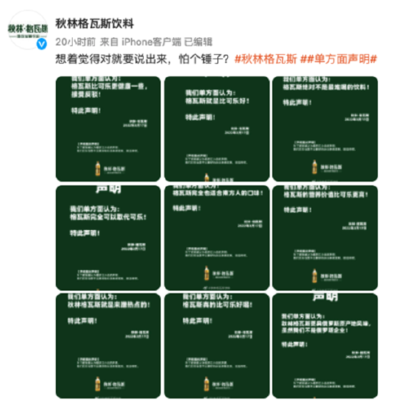 此次“秋林发声明称比可乐好喝”词条也快速登上了热搜。有格瓦斯爱好者表示“格瓦斯真的越喝越上头”,也有人吐槽格瓦斯销售渠道窄,在南方的超市基本买不到。也有网友“单方面”宣布,“格瓦斯胜利了”,“做鸡翅完全可以去取代可乐。”