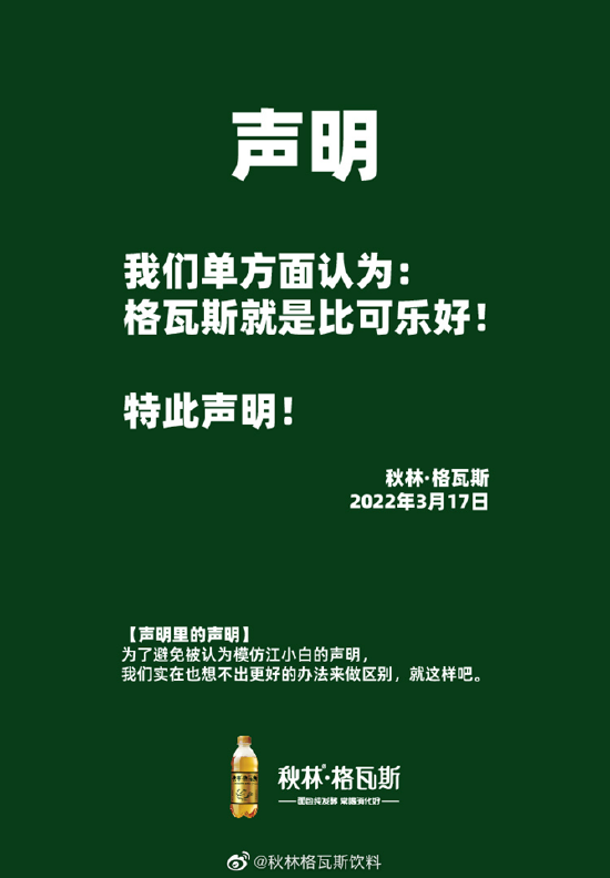 而在3月17日,“秋林格瓦斯饮料”官方微博也公开喊话可乐,称“格瓦斯就是比可乐好”,并誓言要“完全取代可乐”。一时之间,登上热搜的格瓦斯在国内也吸足了眼球。