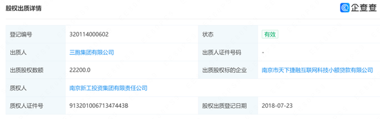 而大股东三胞集团有股权冻结和股权出质。2018年7月23日,三胞集团向南京新工投资集团有限责任公司出质了捷融小贷的股权,出质数额为22200。此外,其法定代表人王翔也已被限制高消费。