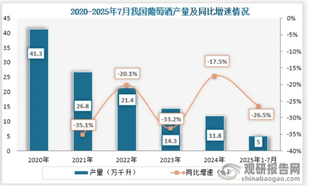 从产量来看,2020年到2024年我国葡萄酒产量持续下降,到2024年我国葡萄酒产量为11.8万千升,同比下降17.5%,创阶段新低。今年以来,国内葡萄酒行业颓势仍在延续。