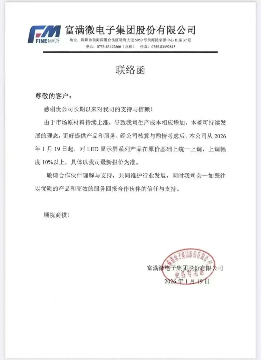 1月19日,富满微电子发布联络函表示,由于市场原材料持续上涨,导致我司生产成本相应增加。公司从2026年1月19日起,对LED显示屏系列产品在原价基础上统一上调,上调幅度10%以上,具体以其最新报价为准。