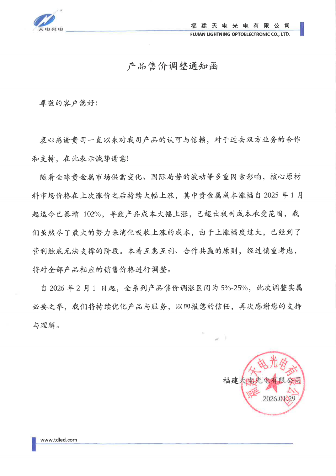 1月29日,天电光电发布产品售价调整通知函并表示,自2025年1月至今,贵金属成本的涨幅已达102%,导致公司全线产品出现大幅亏损,已达到事业无法继续的阶段。本着互惠互利原则,天电光电决定自2026年2月1日起,对全系列产品售价进行调整,调涨区间为5%至25%。