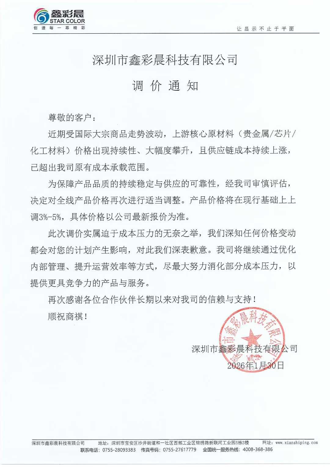 1月13日,强力巨彩发布调价通知函表示,近期受全球局势影响,金、银、铜、铁等金属价格持续上涨,致使LED显示产品的原材料成本显著增加,且供应呈现紧张态势。现将根据市场情况对产品价格进行适度上调,具体价格以最新发布的报价单为准。
