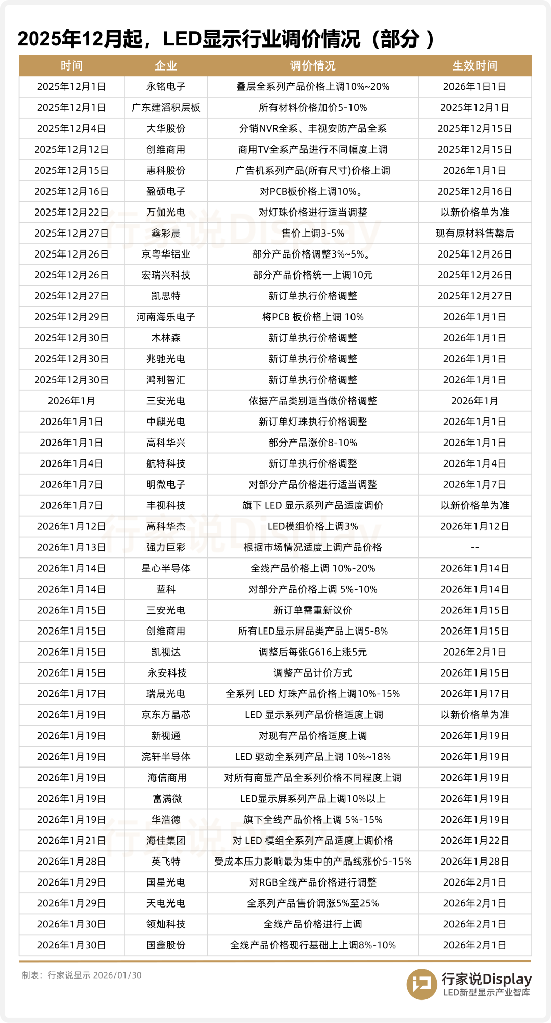 以下是2025年12月起,超30家LED显示相关企业调价最新动态: