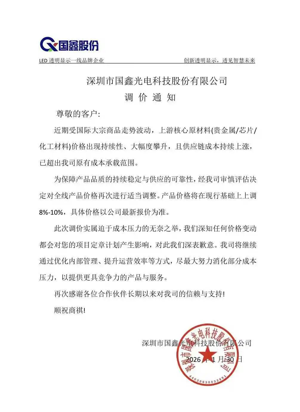 1月30日,LED透明显示企业国鑫股份发布涨价函表示,近期受国际大宗商品走势波动,上游核心原材料(贵金属/芯片/化工材料)价格出现持续性、大幅度攀升,且供应链成本持续上涨,已超出我司原有成本承载范围,现决定对全线产品价格再次进行适当调整。产品价格将在现行基础上上调8%-10%,具体价格以公司最新报价为准。